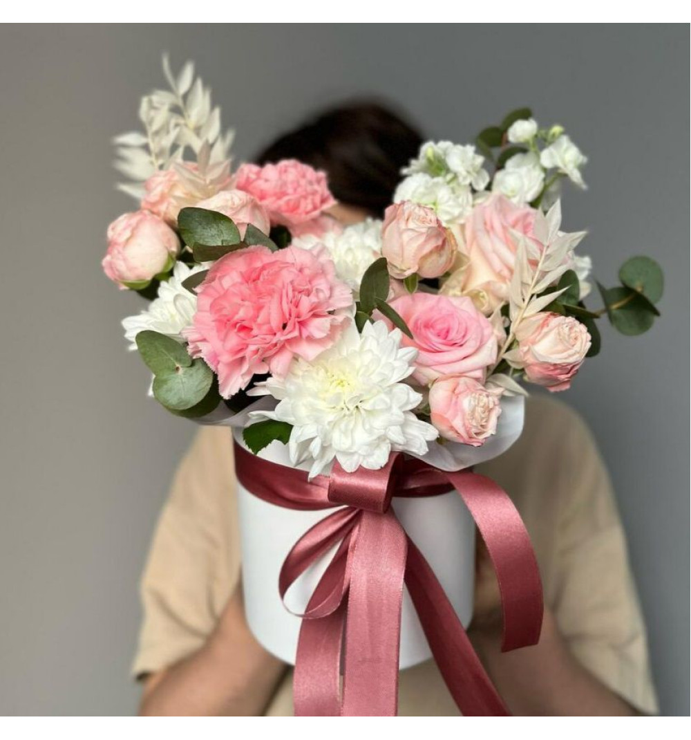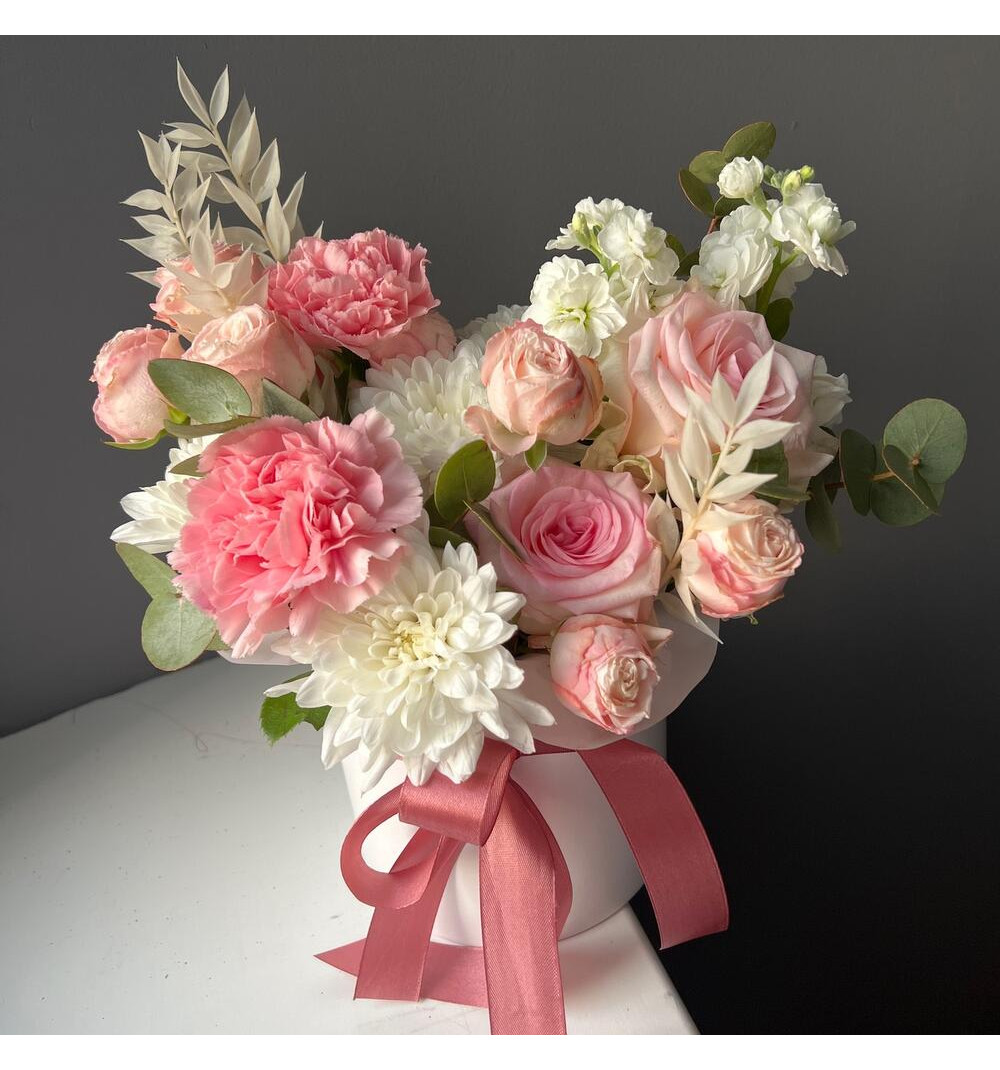 Купить Кустовые пионовидные розы, маттиола и хризантема в шляпной коробочке в Есике за 15 000 ₸ | интернет-магазин «Guls»