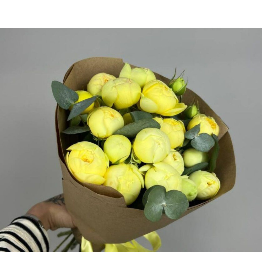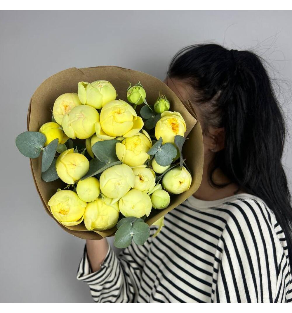 Этот изысканный букет, состоящий из прекрасных пионовидных роз желтого оттенка символизируют радость и дружбу. Этот нежный и элегантный букет дополняется веточками эвкалипта, придающими композиции особую свежесть и легкость. Яркость и нежность розочек и изысканный аромат эвкалипта создадут атмосферу тепла и уюта в любом помещении. Подарите этот прекрасный букет своим близким или любимому человеку, чтобы выразить свои чувства и создать впечатления, которые останутся в памяти на долгое время.